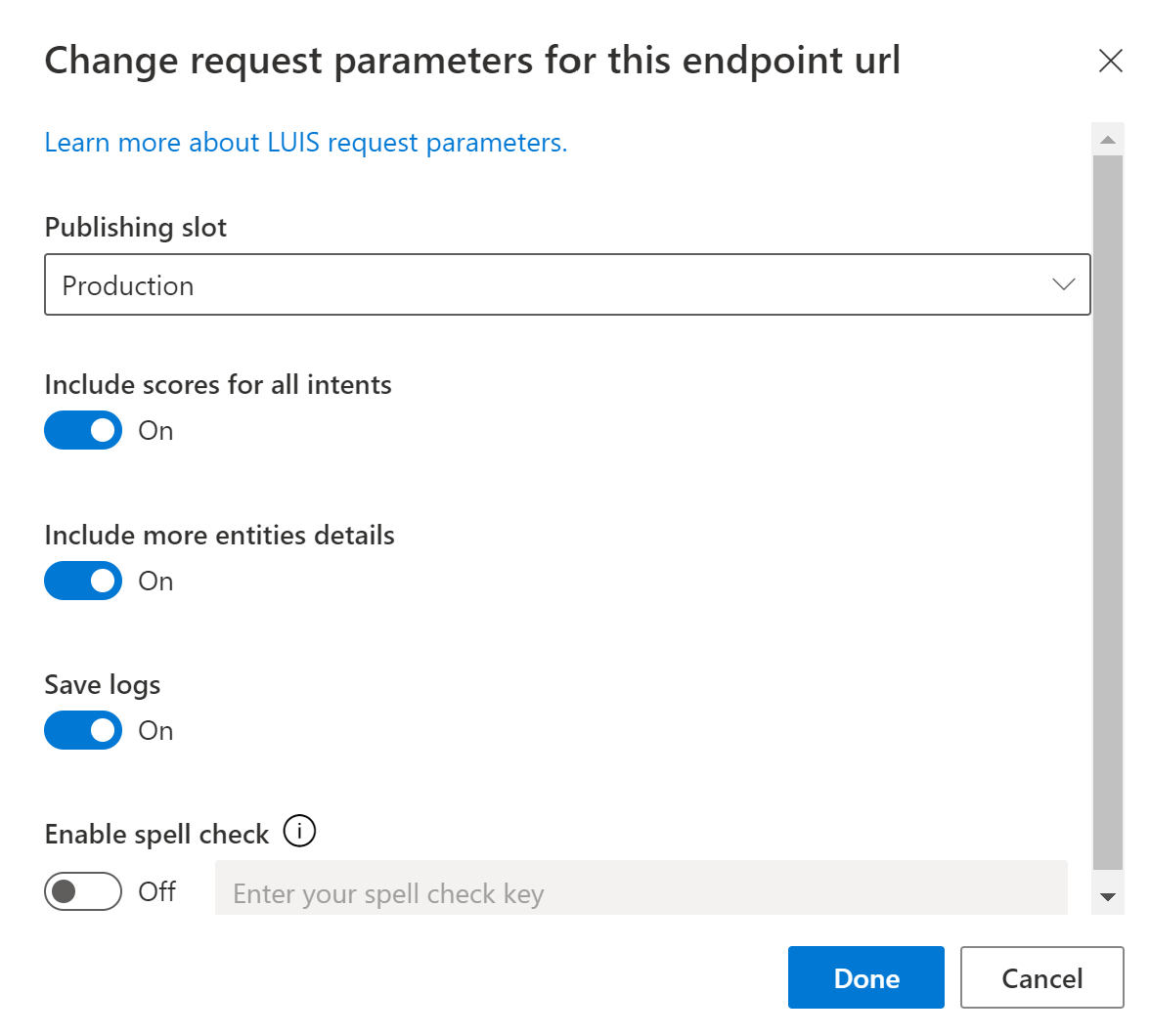 This action changes the example URL by adding the log=true query string parameter. Copy and use the changed example query URL when making prediction queries to the runtime endpoint.