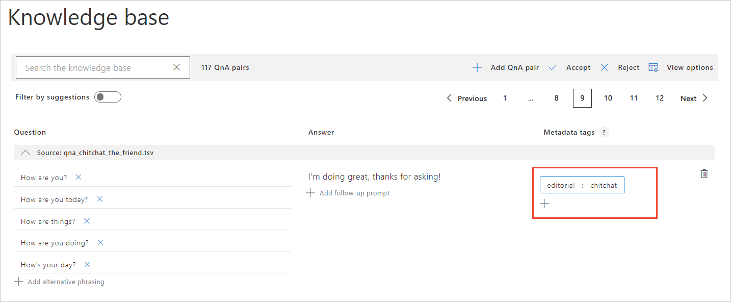 When you edit your KB, you will see a new source for chit-chat, based on the personality you selected. You can now add altered questions or edit the responses, just like with any other source.