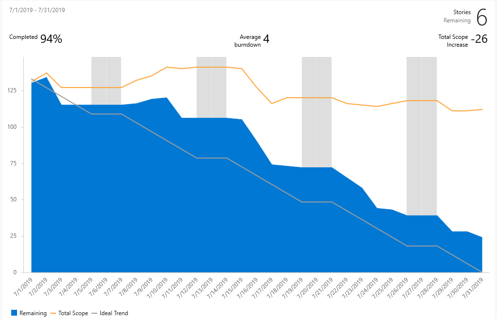 | Total Scope Increase | Shows the change in how much work from the original scope since the burndown started. The example shows that six work items were removed. |