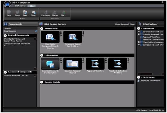 The OBA Composition Reference Toolkit reveals the underlying composition capabilities of the Microsoft Office system. It integrates seamlessly with the Microsoft Office system to enable a prescriptive, application-composition experience for information workers. These information workers can then go on to build and deploy OBAs by using semantically related OBA components such as workflows; document libraries, lists, and pages in Microsoft Office SharePoint Server 2007; Web parts; client add-ins for Microsoft Visual Studio Tools for Office (VSTO); business intelligence (BI) reports; BI dashboards; and so on. The Toolkit contains a Microsoft OBA Composition Server and an OBA Composer. The OBA Composition Server includes metadata, administration, and provisioning services to enable cataloging of OBA components, administering and managing components, defining semantic relationships between components, defining the bindings between components and line-of-business systems, and to support the deployment of OBAs that users have composed by using the components. The OBA Composer is a Windows Presentation Foundation (WPF) application that consumes and uses the services of the OBA Composition Server to enable a rich client and prescriptive user experience for composing and deploying OBAs. The Administration user interface for the OBA Composition Reference Toolkit is integrated into the Central Administration portal of Office SharePoint 2007.