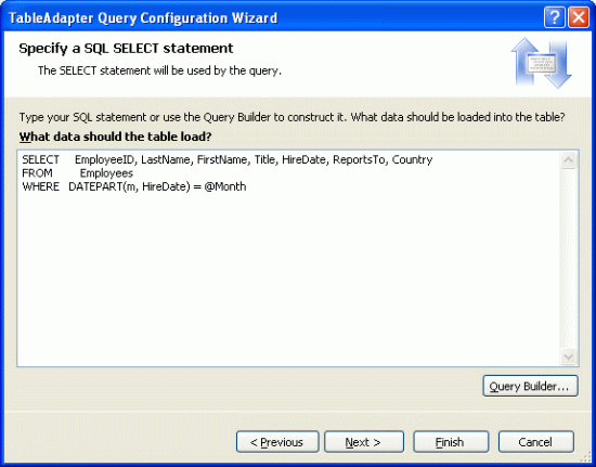 Choose to add a SQL statement that returns rows. When you reach the Specify a SELECT Statement screen the default SELECT statement for the EmployeesTableAdapter will already be loaded. Simply add in the WHERE clause: WHERE DATEPART(m, HireDate) = @Month. DATEPART is a T-SQL function that returns a particular date portion of a datetime type; in this case we're using DATEPART to return the month of the HireDate column.