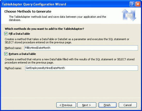 Click Finish to complete the wizard and return to the DataSet's design surface. The EmployeesTableAdapter should now include a new set of methods for accessing employees hired in a specified month.