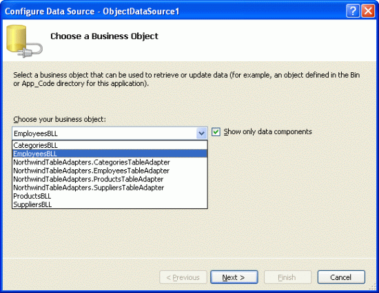 Our final step for this example is to display those employees whose hiring anniversary is this month. Start by adding a GridView to the ProgrammaticParams.aspx page in the BasicReporting folder and add a new ObjectDataSource as its data source. Configure the ObjectDataSource to use the EmployeesBLL class with the SelectMethod set to GetEmployeesByHiredDateMonth(month).