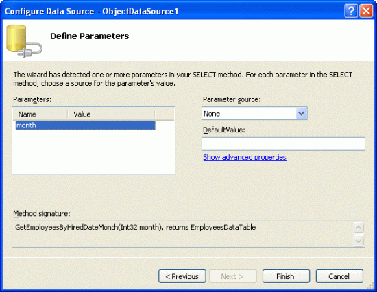 The final screen asks us to provide the month parameter value's source. Since we'll set this value programmatically, leave the Parameter source set to the default None option and click Finish.