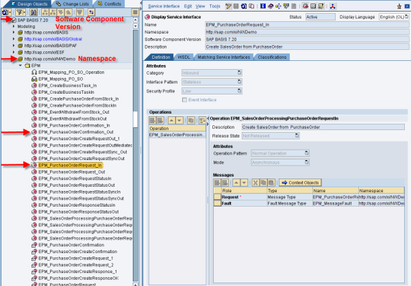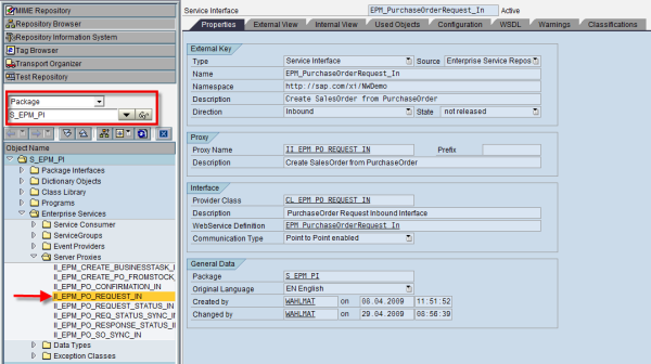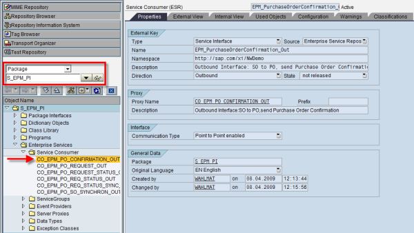 Service design for the PO/Confirmation scenario has already taken place. The design-time objects are in the ES Repository. To display the objects: