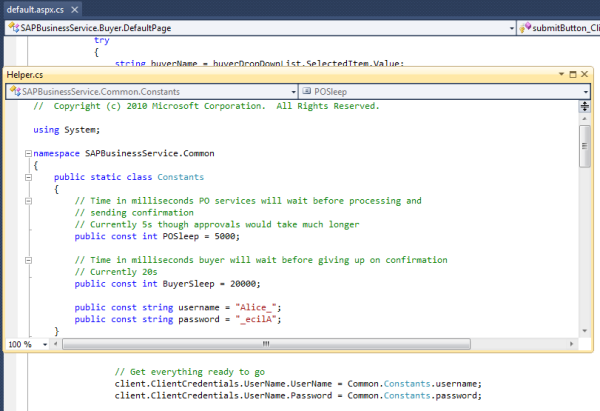 The PO/Confirmation scenario is designed to replicate high-latency business exchanges. SAP does not support addressable clients, which is the WS-Addressing approach for messaging in such situations. The .NET Framework 4 client application code must therefore correlate two distinct one-way messages, the Purchase Order and Confirmation requests. The approach used in the Confirm.svc.cs file in the Buyer folder of the solution is appropriate for demonstration purposes.