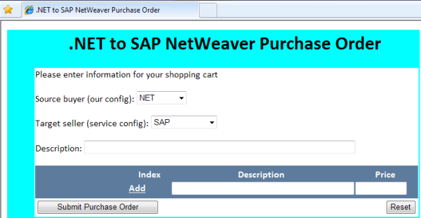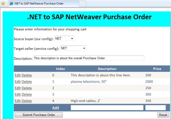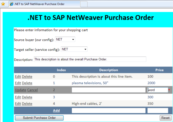 - To add an item into the purchase order message, in the Price box type a price, in the Description optionally type a description for the item, and then click Add. This step adds an item to the purchase order and displays a grid that contains all of the items in the current purchase order. You can repeat this step to add as many items to the purchase order as you want.