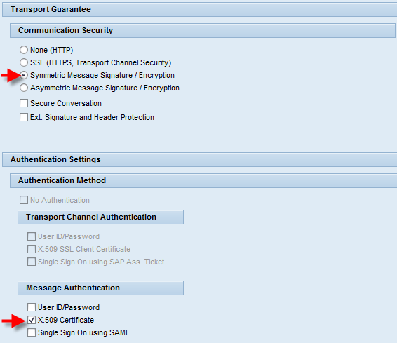 5.3.3 Using Authentication with X.509 Certificate on Message LevelInstead of providing a user ID and password, consumers can authenticate themselves using an X.509 certificate token on message level. Message transport is secured by using symmetric encryption. Optionally you can enable WS-SecureConversation. See the Authentication with UsernameToken (WSS Usernametoken) section for more information about WS-SecureConversation. 5.3.3.1 AS ABAP Provides a ServiceSelect the following options in transaction SOAMANAGER on the Provider Security tab.