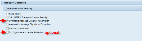 Note This scenario uses the STS endpoint at http://131.107.153.205:8080/trust/X509. The non-default HTTP port 8080 is important because the STS implementation hosted at http://131.107.153.205/trust uses WS-Policy 1.5. To review the list of supported protocols for these interoperability scenarios, see the Supported Standards section of this document. 5.3.5 Further CombinationsYou can combine all security scenarios with Message Transmission Optimization Mechanism (MTOM) and Web Services Reliable Messaging 1.1. When you are using message signature and encryption, on the SAP side you can select Ext. Signature and Header Protection. This activates the function’s signature confirmation, signature encryption, and header encryption of the WS-Security 1.1 standard. If a request contains the signature, the response confirms the contained signature. The signature and signature confirmation are encrypted. An SAP provider encrypts trace and session headers, not the protocol headers provided by for example WS-RM, WS-Addressing, etc. An SAP consumer encrypts headers, if the WSDL document requires it.