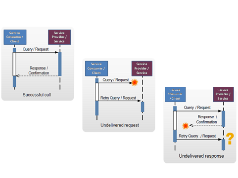Figure 29 Potential error situations in synchronous communication Synchronous communication does not guarantee message delivery. If a request or the response to the request is not delivered, the service consumer/client retries to send the request. That could lead to more than one service executions in the service provider system. For many services however, it is crucial that the service is executed reliably once when requested. For example, if a new purchase order is to be created using a service invocation, it is neither acceptable to have no purchase order created nor to have two or more duplicates created. To ensure reliable messaging for synchronous services, SAP provides a protocol on the application layer. All synchronous services that result in a database change have to be idempotent. That means a service call has the same effect irrespective of whether the provider receives the request message once or multiple times. More information: Enterprise Services Index > Technical Concepts > Idempotent Service 5.4.5.1 SAPTo ensure that a service is idempotent, you have to do the following: