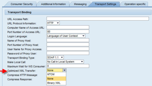 Figure 31 Consumer proxy configuration for optimized XML transfer 5.6.1.1 MTOM with WS-Security 1.0 (Mutual certificate authentication) ScenarioSAP Provider