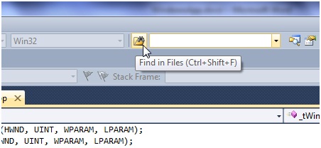 To find out what strings are named IDS_APP_TITLE and IDC_SECOND, if you didn’t know how resources work in a Visual Studio project, you could use the Find in Files feature of Visual Studio. Click the toolbar button that shows a pair of binoculars over a file folder: