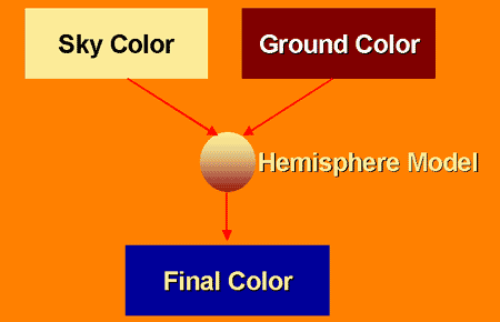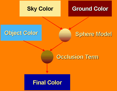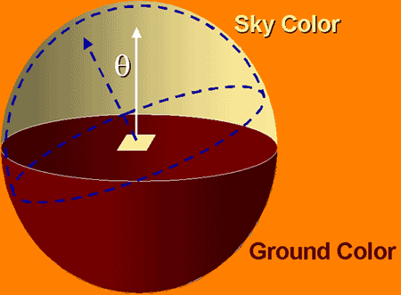 The 2-term calculation boils down to what percent of incident energy has what color. The far field hemisphere is composed of 2 colors, sky, and ground, in a simple proportion. Even with the environment simplified to two colors like this, the model still allows for dynamic updates, like when a car enters a canyon or a tunnel, and then leaves it; so the pavement or ground color would change, or the sky or roof color would change. The hemisphere implementation can also be done either per-vertex or per-pixel.
