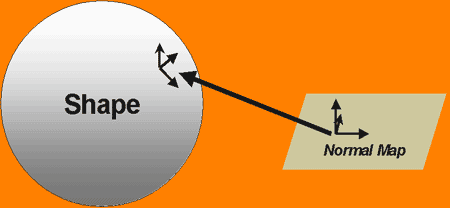 One thing you may have wondered about u, v, and w, is where in the world are these vectors? At first, it looks like they are part of the texture. In reality, these vectors get pasted onto the real world object that is being textured. At each vertex, u, v, and w might point in an entirely different direction! So, two places on a mesh that have the same piece of texture might have completely different vectors, since u, v, and w are different. Remember, an x, y, z vector in the normal map really means x*u + y*v + z*w. If u, v, w are different, then the vectors are different even if x, y and z are the same. The hard part is finding u, v, and w; after that, everything else is pretty straightforward.