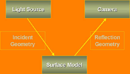 The process of the basic lighting model is based on the physics of lighting. Figure 8 shows the physical model the calculations are intended to reproduce. There is a light source generating light, a surface geometry upon which the incident light energy is received, and upon which reflected light departs (called the incident and reflectant geometry), and a camera to record the lighting.