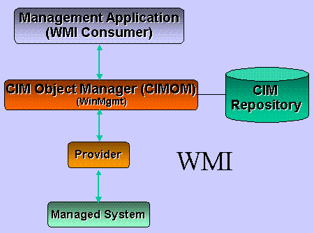 Next is CIMOM, the CIM Object Manager, which has its own storage repository and acts as a broker for object requests. CIMOM and its repository are represented on the system by the system service called WinMgmt. Providers plug into CIMOM via a published set of COM interfaces. CIMOM keeps track of what classes are available (their definitions are stored in the repository) and what provider is responsible for supplying instances of those classes. When a request for management information comes from a WMI consumer to CIMOM, it evaluates the request, identifies which provider has the information, and upon getting it returns the data to the consumer. The consumer only needs to ask for the information it wants but at no time needs to know the exact source of it or any details of how it is extracted from the underlying API. It should be noted that static data can be stored in the repository and retrieved without a provider, but the real power of the WMI system is that it supplies dynamic information about the managed system, and this is done entirely through providers.