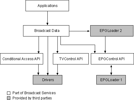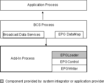 - EPG Infrastructure—This; infrastructure provides an interface for applications to access an EPG database. It also provides a mechanism for EPG data to be loaded into an EPG database independent of how the EPG data is delivered. Finally, it provides an interface for the rest of the BCS components to access the EPG. The EPG infrastructure clearly separates the delivery of EPG data from application access to the data, which makes it possible to have multiple EPG data providers and multiple EPG user interface providers.