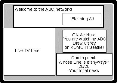 When using the TVControl, the user can change channels with a remote control, as with a traditional TV. In the interactive world, there are new possibilities for changing channels. For example, channels can be changed by going to a Web page for a particular network. The page might use a TVControl and provide a window within the Web page tuned to the local affiliate. Figure 2 illustrates what the TV screen might look like.