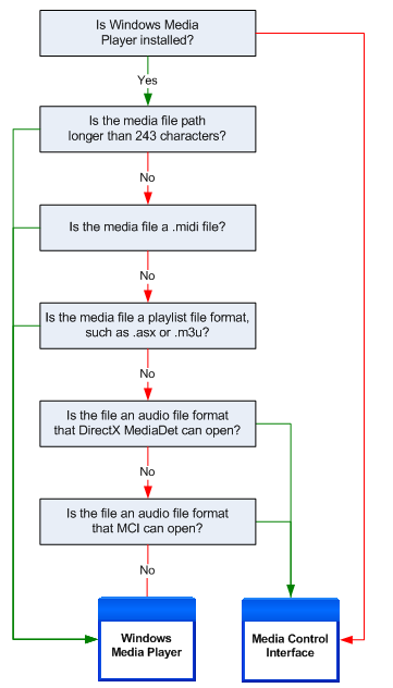 The two diagrams below illustrate the decision logic PowerPoint performs when determining which player to use for a specified media file. The first diagram illustrates the process with audio files; the second, video files.