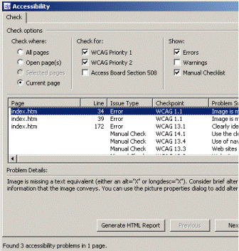 To access the accessibility checker on the Tools menu click Accessibility. You can****use the accessibility checker to check a single page or an entire Web site. As you can see in Figure 9, the accessibility checker checks for varying levels of accessibility and specifically for adherence to Section 508 of the U.S. Rehabilitation Act. You can check for errors or warnings, and you can add a manual checklist.