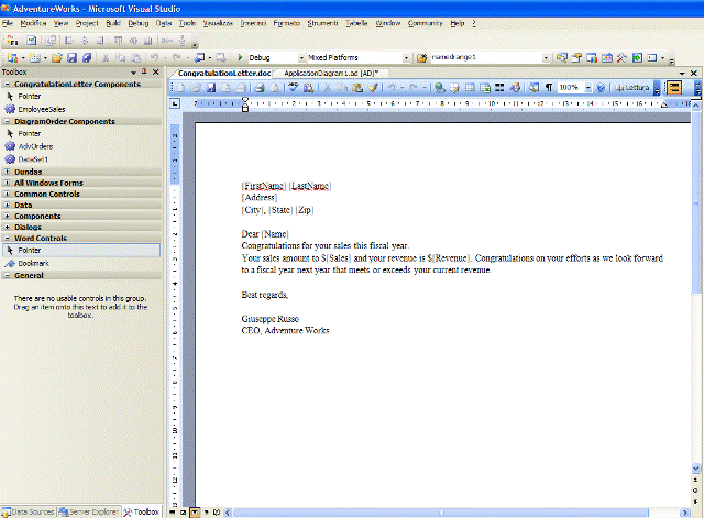 Private Sub Button1_Click(ByVal sender As System.Object, ByVal e As System.EventArgs) Handles Button1.Click ListEmployee.Visible = True Label3.Visible = True Dim Ds2 As New DataSet Ds2 = AdvWebService.ListEmployeeSales(ListTerritory.SelectedValue.ToString) ListEmployee.DataSource = Ds2 ListEmployee.DisplayMember = "SalesEmployeeTable.LastName" ListEmployee.ValueMember = "SalesEmployeeTable.EmployeeID" End Sub Private Sub Button2_Click(ByVal sender As System.Object, ByVal e As System.EventArgs) Handles Button2.Click Dim Ds3 As New DataSet Ds3.Clear() Ds3 = AdvWebService.EmployeeInformation(ListEmployee.SelectedValue.ToString) Dim FName As New Binding("Text", Ds3, "EmployeeInformation.FirstName") Dim LName As New Binding("Text", Ds3, "EmployeeInformation.LastName") Dim AddressL As New Binding("Text", Ds3, "EmployeeInformation.AddressLine1") Dim PCode As New Binding("Text", Ds3, "EmployeeInformation.PostalCode") Dim City As New Binding("Text", Ds3, "EmployeeInformation.City") Dim DearName As New Binding("Text", Ds3, "EmployeeInformation.FirstName") Dim TotalSales As New Binding("Text", Ds3, "EmployeeInformation.SalesLastYear") Dim TotalRevenue As New Binding("Text", Ds3, "EmployeeInformation.SalesQuota") CongratulationLetter.Globals.ThisDocument.FirstName.DataBindings.Clear() CongratulationLetter.Globals.ThisDocument.FirstName.DataBindings.Add(FName) CongratulationLetter.Globals.ThisDocument.LastName.DataBindings.Clear() CongratulationLetter.Globals.ThisDocument.LastName.DataBindings.Add(LName) CongratulationLetter.Globals.ThisDocument.address.DataBindings.Clear() CongratulationLetter.Globals.ThisDocument.address.DataBindings.Add(AddressL) CongratulationLetter.Globals.ThisDocument.zip.DataBindings.Clear() CongratulationLetter.Globals.ThisDocument.zip.DataBindings.Add(PCode) CongratulationLetter.Globals.ThisDocument.city.DataBindings.Clear() CongratulationLetter.Globals.ThisDocument.city.DataBindings.Add(City) CongratulationLetter.Globals.ThisDocument.Dear.DataBindings.Clear() CongratulationLetter.Globals.ThisDocument.Dear.DataBindings.Add(DearName) CongratulationLetter.Globals.ThisDocument.TotalSales.DataBindings.Clear() CongratulationLetter.Globals.ThisDocument.TotalSales.DataBindings.Add(TotalSales) CongratulationLetter.Globals.ThisDocument.revenue.DataBindings.Clear() CongratulationLetter.Globals.ThisDocument.revenue.DataBindings.Add(TotalRevenue) End SubThen add the following code inside the subroutine "ThisDocument_Startup".