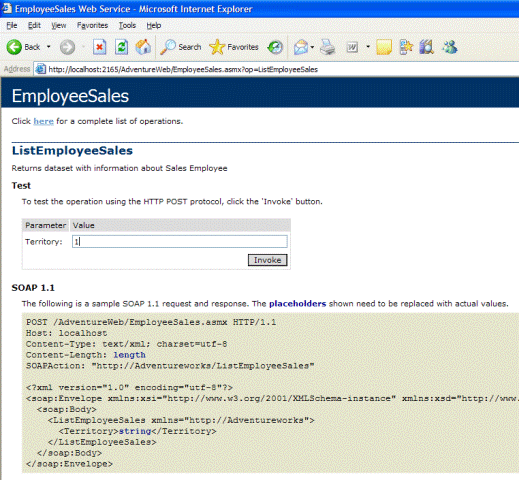 'Return all information about each sales employee <WebMethod(Description:="Return all information about sales employee", _ EnableSession:=False)> _ Public Function EmployeeInformation(ByVal EmployeeID As String) As DataSet Dim EmployeeInfo As New DataSet Dim ConnectionToSQL As New SqlConnection(System.Configuration.ConfigurationManager.AppSettings("ConnectionSql")) Dim daLinks As New SqlDataAdapter("SELECT Person.Contact.FirstName, Person.Contact.LastName, Sales.SalesTerritory.TerritoryID, HumanResources.Employee.EmployeeID, " _ & "Person.Address.AddressLine1, Person.Address.City, Person.Address.PostalCode, SalesPerson_1.SalesLastYear, SalesPerson_1.SalesQuota " _ & "FROM Person.Contact INNER JOIN " _ & "HumanResources.Employee ON Person.Contact.ContactID = HumanResources.Employee.ContactID INNER JOIN " _ & "Sales.SalesPerson AS SalesPerson_1 ON HumanResources.Employee.EmployeeID = SalesPerson_1.SalesPersonID INNER JOIN " _ & "Sales.SalesTerritory ON SalesPerson_1.TerritoryID = Sales.SalesTerritory.TerritoryID INNER JOIN " _ & "HumanResources.EmployeeAddress ON HumanResources.Employee.EmployeeID = HumanResources.EmployeeAddress.EmployeeID INNER JOIN " _ & "Person.Address ON HumanResources.EmployeeAddress.AddressID = Person.Address.AddressID AND " _ & "HumanResources.EmployeeAddress.AddressID = Person.Address.AddressID AND " _ & "HumanResources.EmployeeAddress.AddressID = Person.Address.AddressID AND " _ & "HumanResources.EmployeeAddress.AddressID = Person.Address.AddressID " _ & "WHERE (HumanResources.Employee.EmployeeID = " & EmployeeID & ")", ConnectionToSQL) ConnectionToSQL.Open() daLinks.Fill(EmployeeInfo, "EmployeeInformation") Return EmployeeInfo ConnectionToSQL.Close() End FunctionLast, you must republish the AdventureWeb Web project to a server running ASP.NET 2.0 and IIS 6.0 or IIS 5.0.
