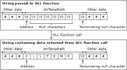 Figure 10.1 shows how the strTempPath string appears in memory when it is passed to the GetTempPath function, and how it appears after the function call is complete.