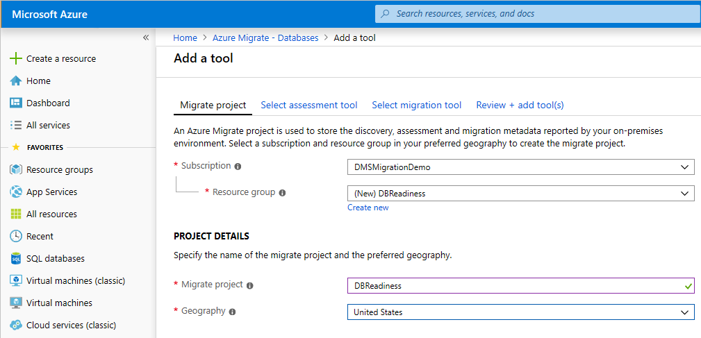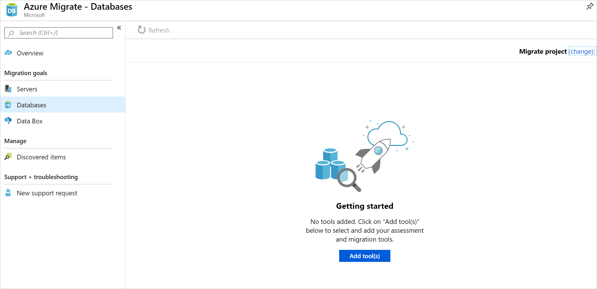 When you create a project, you must add at least one assessment or migration tool.