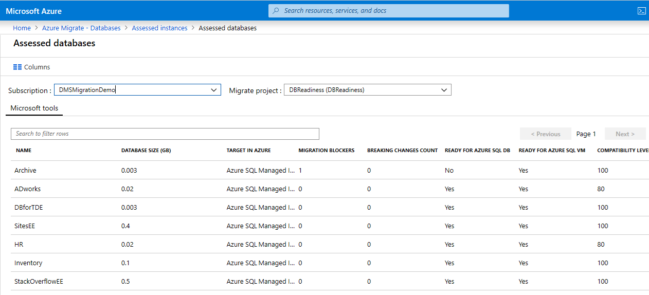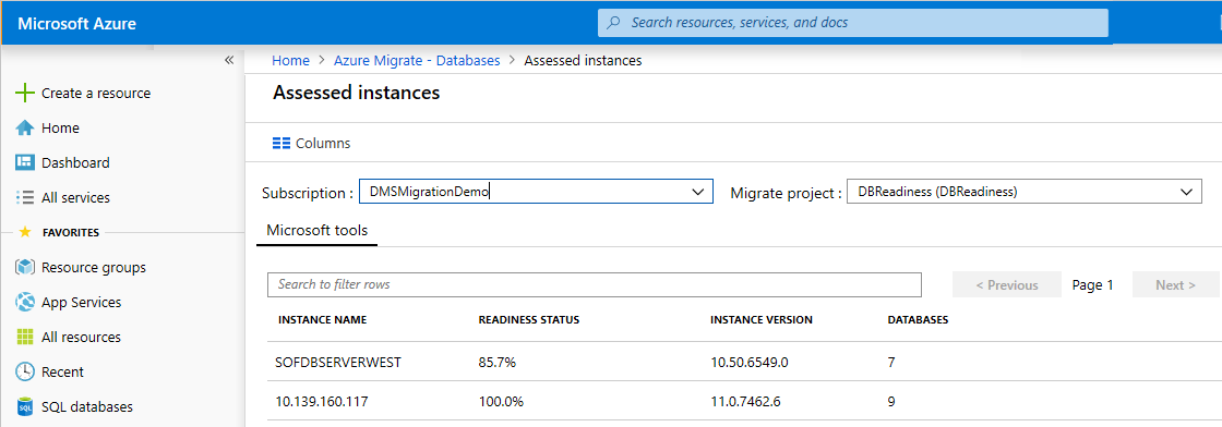 Result Description Assessed database instances The number of SQL Server instances assessed so far Assessed databases Total number of databases assessed across one or more SQL Server instances assessed Databases ready for SQL Database Number of databases ready to migrate to Azure SQL Database (PaaS) Databases ready for Azure SQL VM Number of databases consist one or more migration blockers to Azure SQL Database (PaaS), but ready to migrate to Azure SQL Server VMs Select Assessed database instances to get to SQL Server instance level view.