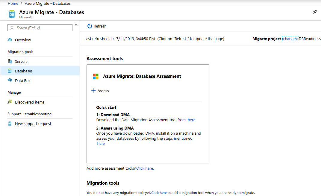 After you successfully create a migration project, under Assessment tools, in the Azure Migrate: Database Assessment box, instructions for downloading and using the Data Migration Assistant tool display.