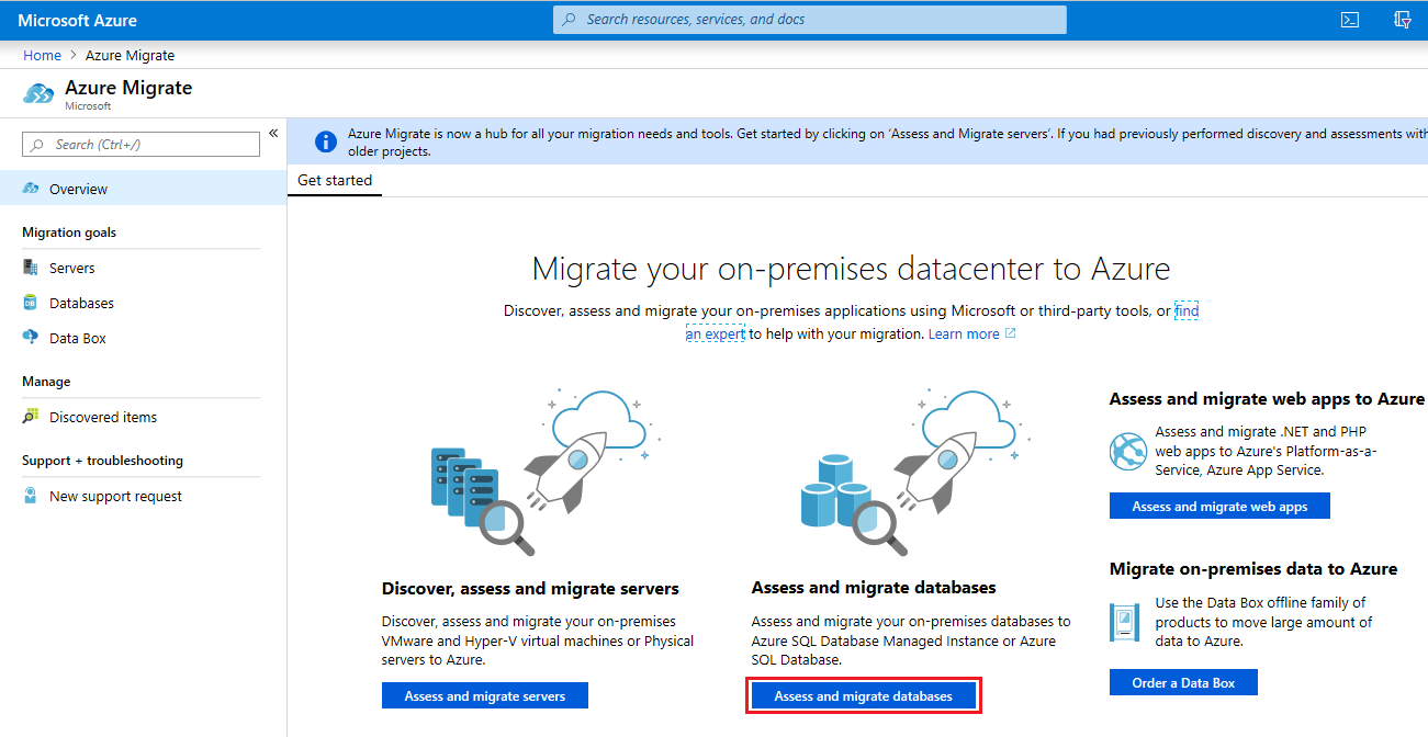 On the Overview page, select Assess and migrate databases.