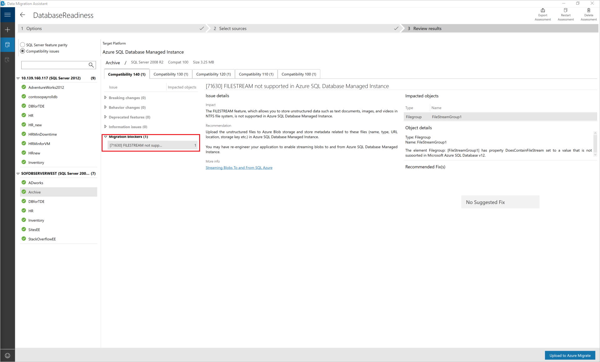 Select Assess and migrate databases to get to the assessment results.