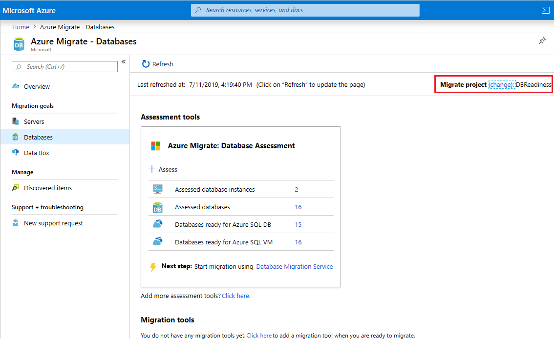You can view the SQL Server readiness summary, make sure that you're on the right migration project, otherwise, use change option to select a different migration project.