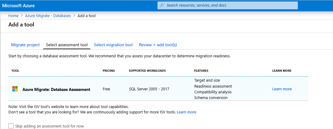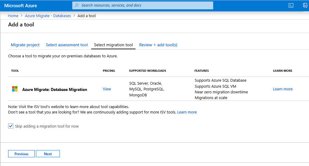 On the Select migration tool tab, Azure Migrate: Database Migration appears as the migration tool to add. If you don't currently need a migration tool, select the Skip adding a migration tool for now. Select Next.