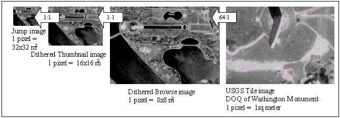 Figure 9. The fine-resolution image of the Washington Monument is used to make an 8 x 8 mosaic. It is then dithered to an image where one pixel is 8 x 8 meters. This thumbnail image is then dithered down to a 16 x 16 meter browse image and a 32 x 32 meter jump image. The TerraServer mosaics these small images to make zoomed-out images.