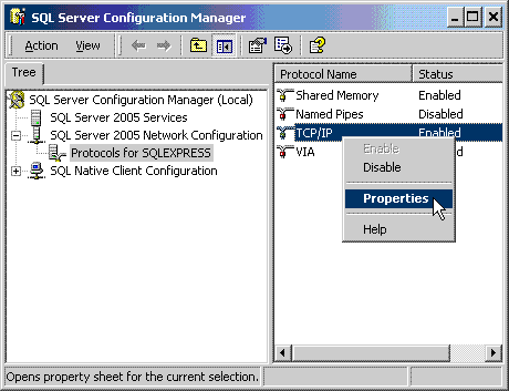 In SQL Server Configuration Manager, select SQL Server 2005 Network/Configuration/Protocols for SQLEXPRESS.