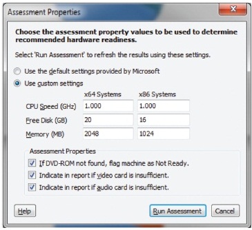 MAP 4.0 provides a new feature that allows you to customize the requirements that the hardware readiness assessment uses. In the Actions pane of the Windows 7 Readiness Summary Results view, you'll find the Set Assessment Properties task. Select this task to bring up the Assessment Properties dialog box shown in Figure 2, which lets you adjust the following hardware requirements for both x64 and x86 architectures: