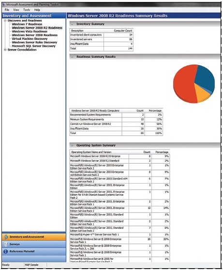 When the assessment is complete, the results are displayed in the MAP console, as shown in Figure 3. For Windows Server 2008 R2 readiness, MAP displays the following four types of assessment results: