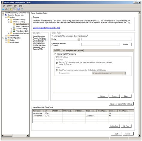 From this Group Policy add-in, you can create a new NRPT rule and edit or delete existing rules. For each rule, you must specify the portion of the namespace to which it applies, whether the special handling for the rule is associated with a specific certification authority (CA), whether the rule is for DNSSEC and its associated settings, and whether the rule is for DirectAccess and its associated settings. There are also advanced global settings that apply to all Windows 7 and Windows Server 2008 R2-based DNS clients.