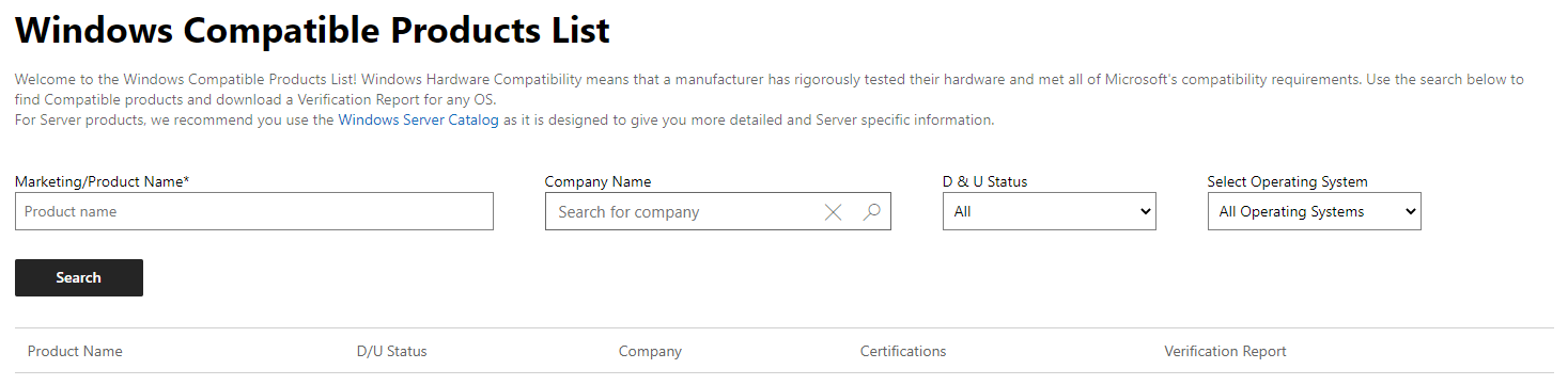You can also use Windows Server Catalog to check whether a product is using a driver that was recently tested, submitted, and signed. To do this, use the Search functionality in Windows Server Catalog for the product name, driver name, or vendor name.
