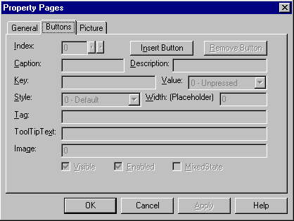 To create a toolbar, you must add Button objects to a Buttons collection; each Button object can have optional text and/or an image, supplied by an associated ImageList control. Set text with the Caption property, and an image with the Image property for each Button object. At design time, you can add Button objects to the control with the Toolbar Property Pages dialog box. At run time, you can add or remove buttons from the Buttons collection using Add and Remove methods.