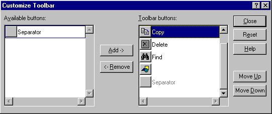 If you set the AllowCustomize property to True, the end user can customize the toolbar by double-clicking it. Double-clicking the toolbar displays the Customize Toolbar dialog box, shown in Figure 2.39 below: