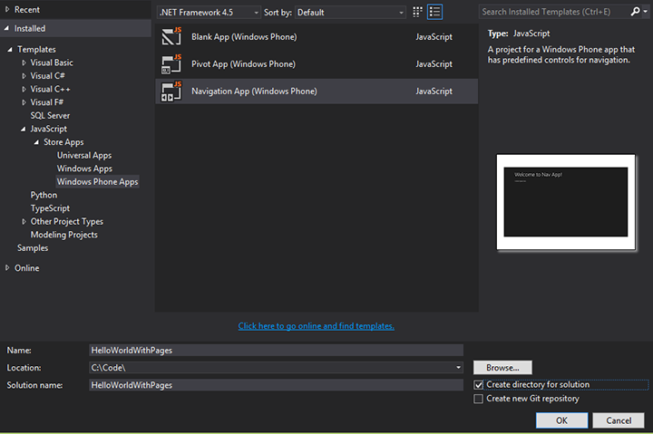 To help you create apps that use the single-page navigation model, the Windows Library for JavaScript (WinJS) provides the WinJS.UI.Pages.PageControl object. There's also the Navigation App project template, which provides some additional navigation infrastructure. In the following steps, you use this template to create a new project.
