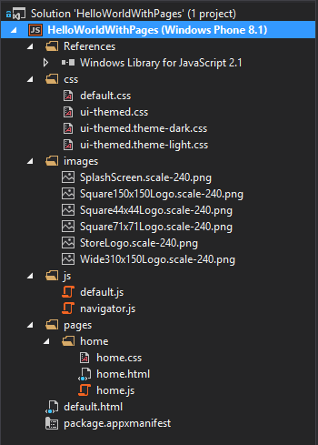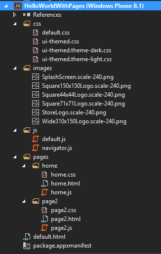 <body> <!-- The content that will be loaded and displayed. --> <div class="fragment homepage"> <header aria-label="Header content" role="banner"> <button data-win-control="WinJS.UI.BackButton"></button> <h1 class="titlearea win-type-ellipsis"> <span class="pagetitle">Welcome to HelloWorldWithPages!</span> </h1> </header> <section aria-label="Main content" role="main"> <p>What's your name?</p> <input id="nameInput" type="text" /> <button id="helloButton">Say "Hello"</button> <div id="greetingOutput"></div> <br /> <div id="toggleControlDiv" data-win-control="WinJS.UI.ToggleSwitch" data-win-options="{title: 'Greeting Color'}"></div> </section> </div> </body>Each PageControl has its own CSS file.
