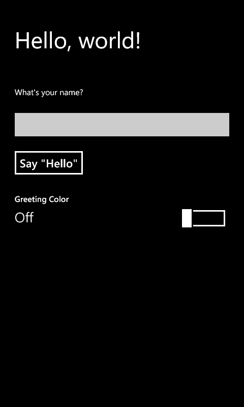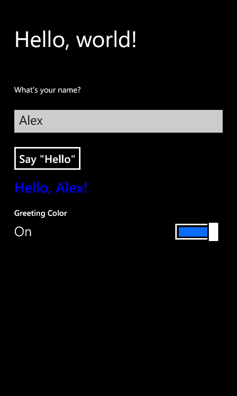 // This function is called whenever a user navigates to this page. It // populates the page elements with the app's data. ready: function (element, options) { // TODO: Initialize the page here. // Retrieve the div that hosts the Toggle control. var toggleControlDiv = document.getElementById("toggleControlDiv"); // Retrieve the actual Toggle control. var toggleControl = toggleControlDiv.winControl; // Register the event handler. toggleControl.addEventListener("change", this.toggleChanged, false); // Retrieve the button and register your event handler. var helloButton = document.getElementById("helloButton"); helloButton.addEventListener("click", this.buttonClickHandler, false); // Retrieve the input element and register your // event handler. var nameInput = document.getElementById("nameInput"); nameInput.addEventListener("change", this.nameInputChanged); },Run the app. It should work just as it did before: when you enter a name and click the button, it displays a greeting. When you flip the ToggleSwitch, the color of the greeting changes.