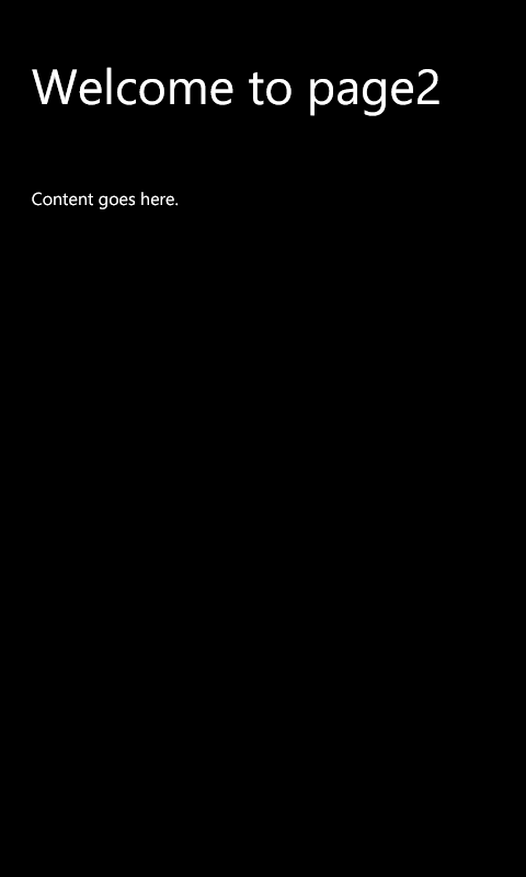 <body> <!-- The content that will be loaded and displayed. --> <div class="fragment homepage"> <header aria-label="Header content" role="banner"> <h1 class="titlearea win-type-ellipsis"> <span class="pagetitle">Hello, world!</span> </h1> </header> <section aria-label="Main content" role="main"> <p>What's your name?</p> <input id="nameInput" type="text" /> <button id="helloButton">Say "Hello"</button> <div id="greetingOutput"></div> <br /> <div id="toggleControlDiv" data-win-control="WinJS.UI.ToggleSwitch" data-win-options="{title: 'Greeting Color'}"></div> <!--A hyperlink to page2.html. --> <p><a href="/pages/page2/page2.html">Go to page 2.</a></p> </section> </div> </body>Run the app and click the link. It seems to work: the app displays page2.html.
