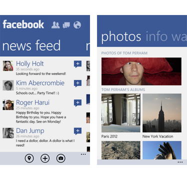 From the home page of a Panorama control, such as that of the Facebook app, you can tap a navigation item in the list and navigate into a Pivot control. This is what happens with the profile selection from the Facebook home Panorama panel. When the user taps the profile selection, they are brought to a Pivot control that presents pivot pages such as wall, info, photos of me, and so on. In this way, you can navigate from one control to the other.