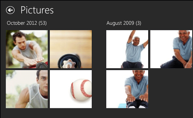 In this topic, we'll take a look at the ListView control in the month page as an example of data binding with different types of data sources. For more info about declarative binding for other controls used in Hilo and non-array data sources, see Using controls. For more info about binding, see Quickstart: binding data and styles. To meet UX requirements for the month page, we needed a flexible method to group and display a very large data set consisting of the images in local Pictures. The month page, shown in the following screenshot, displays images in month-based and year-based groups.