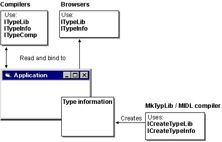 Type information browsers let users scan type libraries to determine what types of objects are available. The following figure shows the interfaces you can use when creating compilers or browsers that access type libraries.