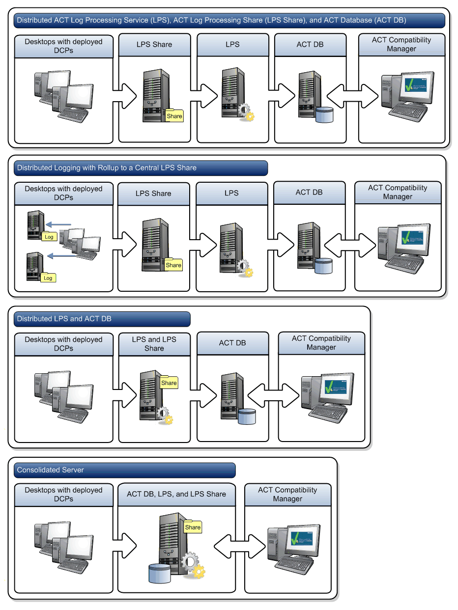 The diagram shows the supported topologies for ACT 5.6 in their recommended usage order. For example, we highly recommend using the distributed ACT Log Processing Service, ACT Log Processing share, and ACT Database topology, and least recommend using a Consolidated Server.